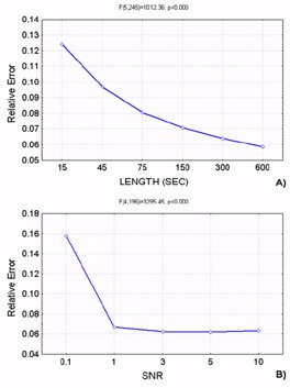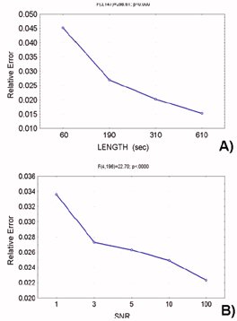 Figure 3. Results of ANOVA performed on the Relative Error resulting from SEM simulations. A): plot of means with respect to signal LENGTH as a function of time (seconds). ANOVA shows a high statistical significance for factor LENGTH (F=288.60, p<0.0001). Post-hoc test (Duncan performed at 5% level of significance) shows statistically significant differences between all levels. B): plot of means with respect to Signal to Noise Ratio. Here, too, a high statistical influence of factor SNR on the error in the estimation is shown (F= 22.70, p<0.0001). Duncan post-hoc test (performed at 5%) points out that there is no statistically significant difference between levels 3, 5 and 10 of factor SNR. Figure 4. Results of ANOVA performed on the Relative Error resulting from DTF simulations. A): plot of means with respect to signal LENGTH as a function of time (seconds). ANOVA shows a high statistical significance for factor LENGTH (F=1012.36, p<0.0001). Post-hoc test (Duncan performed at 5% level of significance) shows statistically significant differences between levels 15 and 45 seconds at 64 Hz sampling rate (equivalent of 960 and 2880 samples) of the factor LENGTH and all the other levels. B): plot of means with respect to Signal to Noise Ratio. Here, too, a high statistical influence of factor SNR on the error in the estimation is shown (F= 3295.45, p<0.0001). Duncan post-hoc test (performed at 5%) points out that there is no statistically significant difference between levels 3, 5 and 10 of factor SNR.