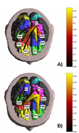 3.3. Imaging cortical connectivity in humans The results of the application of the SEM method for the estimation of the connectivity on the event related potential recordings is depicted in Fig 5, which shows the statistical significant cortical connectivity patterns obtained for the period preceding the movement onset in the subject #1, in the alpha frequency band. Each pattern is represented with arrows, that connect one cortical area ("the source") to another one ("the target"). The colors and sizes of arrows code the level of strength of the functional connectivity observed between ROIs. The labels indicate the names of the ROIs employed. Note that the connectivity pattern during the period preceding the movement in the alpha band involves mainly the parietal left ROI (Pl) coincident with the Brodmann areas 5 and 7, functionally connected with the left and right premotor cortical ROIs (PMl and PMr), the left sensorimotor area (SMl), and both the prefrontal ROIs (PFl and PFr). The stronger functional connections are relative to the link between the left parietal and the premotor areas of both cerebral hemispheres. After the preparation and the beginning of the finger movement, in the POST period changes in the connectivity pattern can be noted. In particular, the origin of the functional connectivity links is positioned in the sensorimotor left cortical areas (SMl). From there, functional links are established with prefrontal left (PFl), both the premotor areas (PMl. PMr). A functional link emerged in this condition connecting the right parietal area (Pr) with the right sensorimotor area (SMr). The left parietal area (Pl) so active in the previous condition was instead linked with the left sensorimotor (SMl) and right premotor (PMr) cortical areas.