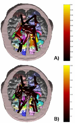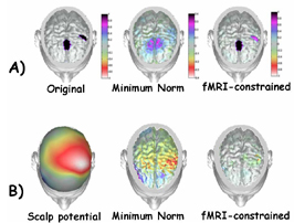Figure 8. The upper row of the Figure (A), presents three cortical current density distributions. The left one showed the simulated cortical regions roughly corresponding to the supplementary motor area and the left motor cortex with the imposed activations represented in black. The current density reconstruction at the centre of the figure presents the results of the estimation of sources presented on the left map without the use of fMRI priors, by using the minimum norm estimate procedure. The current density reconstruction on the right of the figure presents the cortical activations recovered by the use of fMRI priors. The second row of the Figure B) illustrates the scalp (left) and the cortical distributions (center and right) of the current density estimated with the linear inverse approaches from the potential distribution relative to the movement preparation, about 200 ms before a right middle finger extension. The distributions are represented on the realistic subject's head volume conductor model. Left: scalp potential distribution recorded 200 ms before movement execution. Center: cortical estimate obtained without the use of fMRI constraints, based on the minimum norm solutions. Right: cortical estimate obtained with the use of fMRI constraints.