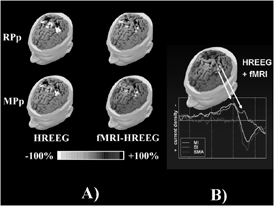 Figure 9. The left part of the Figure (A) shows amplitude gray scale 3-D maps obtained by linear inverse estimates from high resolution electroencephalographic (HREEG) and combined functional magnetic resonance image (fMRI)-HREEG data computed from a subject about 50 ms before (readiness potential peak, RPp) and 20 ms after (motor potential peak, MPp) the onset of the electromyographic activity associated with self-paced right middle finger movements. Percent gray scale of HREEG and combined fMRI-HREEG data is normalized with reference to the maximum amplitude calculated for each map. Maximum negativity (-100%) is coded in white and maximum positivity (+100%) in black. The right part of the Figure (B) presents the estimation of the current density waveforms in regions of interest (ROIs) coincident with the Brodmann areas. The waveforms estimated are relative to the estimation performed with the use of the information from hemodynamic measurements.