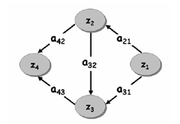 2.2. Estimating the causal dependence between EEG signals with Structural Equation Modeling and Directed Transfer Function Recently, we proposed the use of the Structural Equation Modeling (SEM) and Directed Transfer Function (DTF) for the analysis of the estimated cortical signals, by testing their properties through a simulation study before and then by applying such connectivity tools to real EEG data [Astolfi et al., 2005a,b,c; Babiloni et al., 2005a]. Here, we review the two methods to assess causal relationships between EEG recorded signals. In the SEM the parameters are estimated by minimizing the difference between the observed covariances and those implied by a structural or path model. In terms of neural systems, a measure of covariance represents the degree to which the activities of two or more regions are related. The SEM consists of a set of linear structural equations containing observed variables and parameters defining causal relationships among the variables. Variables in the equation system can be endogenous (i.e. dependent from the other variables in the model) or exogenous (independent from the model itself). The structural equation model specifies the causal relationship among the variables, describes the causal effects and assigns the explained and the unexplained variance [Bollen, 1989]. The public available software LISREL [Jöreskog and Sörbom, 2002] was used for the implementation of the SEM technique. The DTF technique was applied to the set of cortical estimated waveforms obtained for the N ROIs considered, as will be described in details in the paragraph of the linear inverse estimation. The equations employed can be found in [Kaminski and Blinowska, 1991]. 2.3. Computer Simulation The Simulation Study The experimental design we adopted was meant to analyze the recovery of the connectivity pattern under different levels of SNR and signal temporal length, as they have been imposed during the generation of sets of test signals, simulating cortical average activations. The simulated signals were obtained, as described below, starting from actual cortical data, estimated with the high resolution EEG procedures already available at the High Resolution EEG Laboratory of the University of Rome "La Sapienza". Signal Generation for the SEM methodologyDifferent sets of test signals have been generated in order to fit an imposed connectivity pattern (shown in Fig. 2) and to respect imposed levels of temporal duration (LENGTH) and Signal to Noise Ratio (SNR). In the following, in order to use a more compact notation, signals have been represented with the z vector containing both the endogenous and the exogenous variables. Channel z1 is a reference source waveform, estimated from a high resolution EEG (128 electrodes) recording in a healthy subject, during the execution of unaimed self-paced movements of the right finger. Signals z2, z3 and z4 were obtained by contribution of signals from all other channels, with an amplitude variation, plus zero mean uncorrelated white noise processes with appropriate variances. Figure 2. Connectivity pattern imposed in the generation of simulated signals. z1, …, z4 represent the average activities in four cortical areas. Values on the arcs represent the connections strength (a21=1.4, a31=1.1, a32=0.5, a42=0.7, a43=1.2). All procedures of signal generation were repeated under the following conditions: It is worth noticing that the levels chosen for both SNR and LENGTH factors cover the typical range for the cortical activity estimated with high resolution EEG techniques. Signal generation for the DTF methodolog Different sets of test signals have been generated in order to fit an imposed coupling scheme, involving four different cortical areas (shown in Fig.2), as well as to respect imposed levels of Signal to Noise Ratio (factor SNR) and duration (factor LENGTH). Signal z1(t) was a reference cortical waveform estimated from a high resolution EEG recording in a healthy subject, during the execution of self-paced movements of the left finger. Subsequent signals z2(t) - z4(t) were iteratively obtained according to the imposed scheme (Fig.2), by adding to signal zj contributions from the other signals, delayed by intervals tij and amplified by factors aij, plus an uncorrelated Gaussian white noise. Coefficients of the connection strengths were chosen in a range of realistic values as met in previous studies, during the application of other connectivity estimation techniques, like the Structural Equation Modeling, in several memory, motor and sensory tasks [Buchel and Friston, 1997]. Here, the values used for the connection strength were a21=1.4, a31=1.1, a32=0.5, a42=0.7, a43=1.2. The values used for the delay from the i-th ROI to the j-th one (tij) ranged from 1 sample up to the q-2, where q was the order of the MVAR model used. Since the statistical analysis performed with different values of such delay samples returned the same information with respect the variation of this parameter, in the following we particularized the results to the case τ21= τ31= τ32 = τ42 = τ43 = 1 sample, that for a sampling rate of 64 Hz became a delay of 15 ms. All procedures of signal generation were repeated under the following conditions: Performance Evaluation In order to evaluate the quality of the performed estimation, the Frobenius norm of the matrix reporting the differences between the values of the estimated (via SEM) and the imposed connections (Relative Error) was computed for the connectivity patterns obtained with the SEM methodology