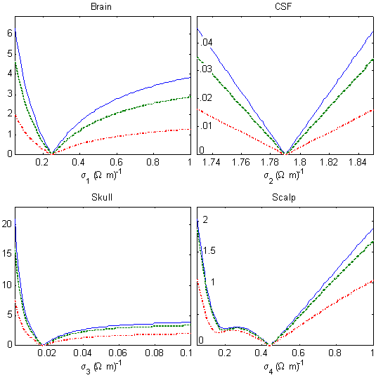 as a function of each head tissue conductivity in a four-sphere model of the human head, assuming 1 µA