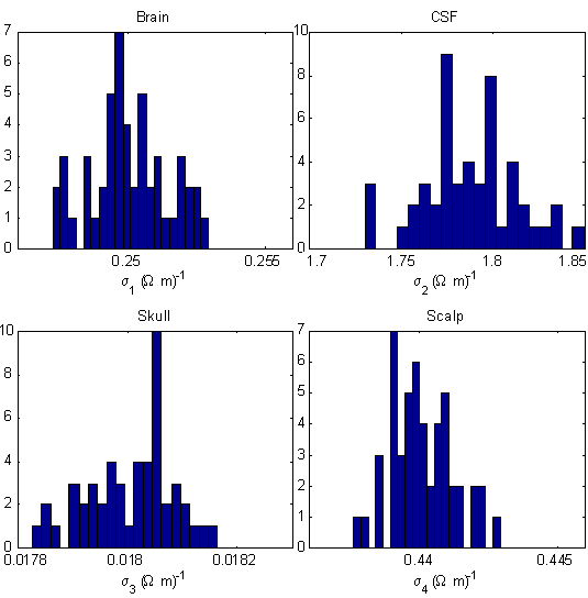 Figure 3. Distribution of retrieved head tissue conductivities in a four-sphere head model,