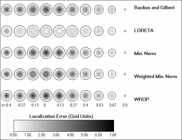 the correct position. This result shows that only LORETA has an acceptable low localization error of 1 grid unit
