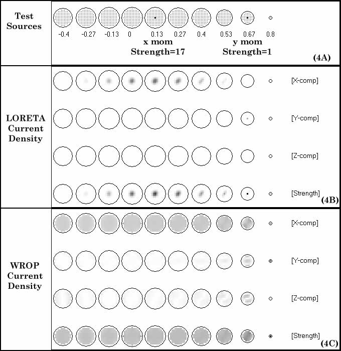 Fig. 4 illustrates the performance of two tomographies, LORETA and WROP, when confronted