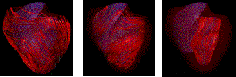 Figure 1. Muscle fibre orientations at three transmural depths: (a) epicardial, (b) midwall, and (c) endocardial. The fibre angle at the LV free wall (on the right in these figures) varies continuously from about –60° to the horizontal plane at the epicardium to +80° at the endocardium. The RV outflow tract is at top left in these figures. Myocardial sheets are formed by layers of tightly coupled myocytes about 4 cells thick [4], which facilitate wall shear and also influence electrical wave propagation (see below). More recently a new Auckland heart model has been developed in rectangular cartesian coordinates with geometry and structural measurements from pig hearts. The fibre orientations are very similar to the previous dog heart measurements but the sheets are more radially oriented. More accurate anatomical measurement in the basal and apical regions of these hearts has resulted in: (i) a better representation of the fibrous skeleton supporting the heart valves (see Fig.2a); (ii) a more accurate parameterisation of the very thin wall at the apex; and (iii) the non-zero imbrication angle at the base and apex which allows the fibres to spiral inward from epicardium to endocardium. 88 elements with tricubic Hermite basis functions are used to capture the myocardial anatomy to within the geometric measurement error of about 0.5mm.