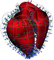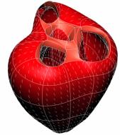New developments in the auckland heart modelP.J. Hunter and A.J. Pullan  ABSTRACTAn anatomically accurate mathematical model of the right and left ventricular myocardium is described, based on measurements of the geometry and fibrous-sheet structure of the pig heart. The model is used for mechanical analysis of ventricular filling with Galerkin finite element techniques and an orthotropic constitutive law based on the fibrous-sheet structure. Bidomain electrical activation of the myocardium is also modeled, with ionic current based electrophysiological equations and reaction-diffusion equations based on orthotropic conductivity tensors referred to the fibrous-sheet material axes. The heart model is also solved with the eikonal wavefront equation and coupled into a torso model to predict the potential distributions on the body surface. INTRODUCTIONComputational modeling of the heart has the potential to link molecular processes at the genomic and proteomic level, through cellular and tissue level models to integrated physiological processes at the whole organ and whole body levels. To achieve this ambitious goal the models must be anatomically accurate, so that the detailed tissue structure can be incorporated, be biophysically detailed, so that tissue material properties can be incorporated, and be linked down to cell electrophysiology, signal transduction pathways and metabolic pathways. In this paper we describe the Auckland heart and torso models which are being developed as part of a world wide “cardiome project” effort [1,2] to use computational modeling of the heart to link cell and tissue behaviour to intact organ and whole body physiological function. VENTRICULAR ANATOMYOur initial finite element model of the geometry and fibrous-sheet structure of the left and right ventricles of the heart was based on measurements from dog hearts and used prolate spheroidal coordinates [3]. Fig.1 shows the geometry and orientation of fibres around the canine heart at epicaridial, midwall and endocardial locations.