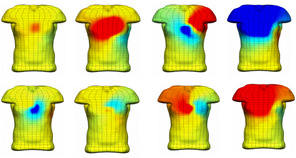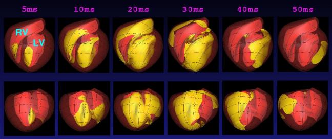 Figure 4. Wavefront locations using an eikonal equation to simulate propagation from the distal ends of the Purkinje tree. For each sample time anterior (top) and posterior (bottom) views are given. COUPLING TO THE TORSOAn anatomically detailed model of the torso has been developed in order to couple cardiac electrical activity to the body surface [15]. Physically the cardiac electrical activity is connected to current flow in the torso via the extracellular potential field. Treating the combined current flow in the heart and torso as a single problem requires an estimated 100GB of storage at a converged resolution [16]. To work around these computational demands the problem is split into two parts: the full bidomain simulation on the heart is used to derive a lower resolution multiple dipole source model to produce body surface signals. The resultant signals are quantitatively different from those obtained in a fully combined approach, due to the limited resolution offered by the dipoles, but qualitatively the pattern is the same. Results from such an approach are given in Fig. 5 [17]. ![]() Figure 5. Anterior images of torso potentials generated from a bidomain solution using the Noble 98 electrophysiological cell model. Images are drawn at 15, 35, 55, 75, 95, 405, 420 and 435 ms after the initial endocardial stimulus. The first 5 images correspond to the QRS interval and the remaining 3 are for the T wave. A full bidomain model (with unequal anisotropy) is used and contains over 250,000 grid points which equates to about 1.2mm spacing. The time step is 0.01ms and at each 10 time steps, 40 equivalent moving dipoles are calculated (one for each of the 40 heart elements). These dipoles are then placed into the torso model containing 1120 cardiac elements, 2 lungs each with 320 elements and the main torso volume is described using 2816 elements. The reference is on the anterior surface and the lower right of the torso. The heart is activated at 3 sites at different times to try to get a reasonable activation sequence. The lightly shaded patches are negative with a maximum negative potential of -0.456mV and the darker patches indicate a positive potential with a maximum potential of 0.252mV. MODELING OTHER CARDIAC PROCESSESAn anatomically realistic model of coronary blood flow has been developed in which the Navier-Stokes equations governing arterial and venous flow have been reduced to one dimension [19]. These flow equations are then combined with a pressure-area relationship which accounts for the compliant vessel wall and time varying compressive force produced by myocardial contraction on these embedded vessels [20]. Fig.6 demonstrates the change in blood flow velocities through the heart cycle, a central result from this modelling study. The next step is to use the predicted distribution of coronary blood flow with a recently developed cellular model of cardiac metabolism [2] such that the supply of oxygen determines the nature of energy production and the resulting effects on myocyte production.
