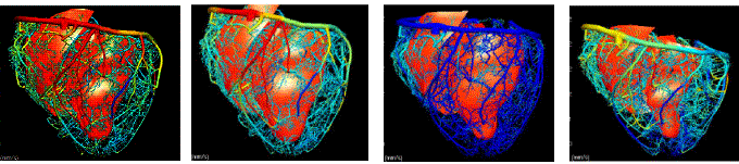 ![]() Figure 6. Coronary arteries used for computation of blood flow, pressure and oxygen transport. Calculated coronary arterial blood flow velocities are shown at the end of the four phases of the cardiac cycle. The darker shade indicates the coronary flow with a maximum value of 250mm/s. APPLICATIONSThe anatomically and biophysically based models of the heart described here are being used for a number of clinical applications. For example, the time-varying distributions of stress and strain throughout the myocardium can be determined for an individual patient, using tagged MRI and measurement of ventricular pressure, and used for diagnosis of aberrant wall motion. Model-based diagnosis of cardiac arrhythmias from body surface measurements and applications to drug discovery will be developed once the models include sufficient detail on signal transduction pathways and metabolic pathways in addition to the current level of electrophysiological detail. For example, class III anti-arrhythmic drugs such as amiodarone, which prolong the action potential plateau by inhibiting IKr or IKs, can give rise to ‘Early After Depolarisations’ (EADs), especially under conditions of hypokalaemia, through reactivation of the ICaL channels [13]. Due to the longer time available for inactivation processes to recover, these channels can reactivate during the plateau. This situation is exacerbated in exercise when b-receptor activation enhances ICaL. The question of whether these EADs can cause Torsade de Pointe arrhythmia is still debated since the electrotonic load in 3D tissue may prevent propagation of the EADs. This is a prime example of the need for anatomically and biophysically detailed heart models. Another example is the use of patient-specific models to aid in the understanding of multiple ECG signals - the so-called inverse problem of electrocardiography. Experiments are currently underway [18] to validate the model-based predications. The heart modeling described above is contributing to the international cardiome project being conducted in collaboration with many of the leading cardiac groups around the world. Ultimately an accurate beating heart is envisioned in which patient-specific profiling (genetic as well as anatomical data) may be incorporated, opening the way for personalised medicine based around model-based predictions. ACKNOWLEDGEMENTSWe would like to acknowledge the contributions from many members of the Bioengineering Institute to the work presented here. In particular, much of the work reported here is based on the recent doctoral research of Carey Stevens, Martin Buist, Karl Tomlinson and Nic Smith. The graphical environment for displaying and interacting with the 3D models is the work of Dr David Bullivant, Dr Richard Christie and Shane Blackett. REFERENCES[1] P. Kohl, D. Noble, R.L. Winslow and P.J. Hunter. “Computaitonal modelling of biological systems: tools and visions.” Phil. Trans. Roy. Soc. Lond. A358, pp.579-610, 2000. [2] N.P. Smith, P.J. Mulquiney, M.P. Nash, C.P. Bradley, D.P. Nickerson and P.J. Hunter. “Mathematical modelling of the heart: cell to organ.” Chaos Sol. Frac. Vol.13, pp.1613-1621, 2002 [3] I.J. LeGrice, P.J. Hunter and B.H. Smaill. “Laminar structure of the heart: a mathematical model.” J. Physiol. Vol.272, pp.H2466-H2476, 1997. [4] I.J. LeGrice, P.J. Hunter, A.A. Young and B.H. Smaill. “The architecture of the heart: a data-based model.” Phil. Trans. Roy. Soc. Vol. 359, pp.1217-1232, 2001. [5] M.P. Nash and P.J. Hunter. “Computational Mechanics Of The Heart.” J. Elasticity Vol.61(1-3), pp.113-141, 2001. [6] P.J. Hunter, A.D. McCulloch and H.E.D.J. ter Keurs. “Modeling the mechanical properties of cardiac muscle.” Prog. Biophys. Molec. Biol. Vol.69, pp.289-331, 1998. [7] K.D Costa, P.J. Hunter, J.S. Wayne, L.K. Waldman, J.M. Guccione and A.D. McCulloch. “A three-dimensional finite element method for large elastic deformations of ventricular myocardium: Part II - Prolate spherical coordinates.” J. Biomech. Eng. Vol.118, pp.464-472, 1996. [8] C. Luo and Y. Rudy. “A Dynamic model of the cardiac ventricular action potential - simulations of ionic currents and concentration changes.” Circ. Res., Vol.74, pp.1071-1097, 1994. [9] D. Noble, A. Varghese, P. Kohl and P. Noble. “Improved guinea-pig ventricular cell model incorporating a diadic space, IKr and IKs, and length- and tension-dependent processes.” Can. J. Cardiol., Vol.14, pp.123-134, 1998. [10] D.P. Nickerson, N.P. Smith and P.J. Hunter. “A model of cardiac cellular electromechanics.” Phil. Trans. Roy. Soc. Vol. 359, pp.1159-1172, 2001. [11] P. Kohl, P.J. Hunter and D. Noble. “Stretch-induced changes in heart rate and rhythm: clinical observations, experiments and mathematical models.” Prog. Biophys. Molec. Biol. Vol.71(1), pp.91-138, 1999. [12] P.J. Hunter and B.H. Smaill. “Electromechanics of the heart based on anatomical models.” In Cardiac Electrophysiology: from cell to bedside. 3rd Edn.. Eds Zipes and Jalife. Saunders. Vol.32, pp.277-283, 2000. [13] C. Antzelovitch, V.V. Nesterenko, A.L. Muzikant, J.J. Rice, G. Chien and T. Colatsky. “Influence of transmural gradients on the electrophysiology and pharmacology of ventricular myocardium. Cellular basis for the Brugada and long-QT syndromes.” Phil. Trans. Roy. Soc. Lond. A359, pp.1201-1216, 2001. [14] K.A. Tomlinson, P.J. Hunter and A.J. Pullan. “A finite element method for an eikonal equation model of myocardial excitation wavefront propagation.” SIAM J. Appl. Math. (In press), 2002. [15] C.P. Bradley, A.J. Pullan and P.J. Hunter. “Geometric modeling of the human torso using cubic Hermite elements.” Ann. Biomed. Eng. Vol.25, pp.96-111, 1997. [16] M.L. Buist and A.J. Pullan. “From cell to body surface: a fully coupled approach.” J. Electrocardiology, Vol.34, pp.191-195, 2001. [17] M.L. Buist. Modelling cardiac activity from cell to body surface, PhD Thesis, University of Auckland, 2
