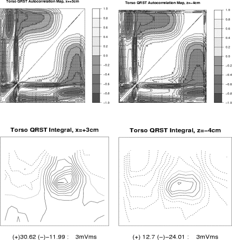 Figure 1. AC maps (top) and QRST integral maps (bottom) of tank surface ECG recordings obtained with the heart at positions 5 cm apart in the tank (x+3 and z-4). In integral maps continuous lines are positive isointegrals while dashed lines are negative isointegrals.(+) and (-) represent maximal and minimal. isointegral values. AC maps have the same time interval during the QRST on both x and y. References J Abildskov, MJ Burgess, RL Lux, R Wyatt, and M Vincent. The expression of normal ventricular repolarization in the body surface distribution of T potentials. Circulation, 54: 901--906, 1976. AD Corlan, R Corlan, and L De Ambroggi. Variability of simulated {ECG} autocorrelation maps with electrode placement. Int J Bioelectromagnetism, 4: 347--348, 2002. AD Corlan and L De Ambroggi. New quantitative methods of ventricular repolarization analysis in patients with left ventricular hypertrophy. It Heart J, 1: 542--548, 2000. L De Ambroggi, MS Negroni, E Monza, T Bertoni, and PJ Schwartz. Dispersion of ventricular repolarization in the long QT syndrome. Am J Cardiol, 68: 614--620, 1991. R Hoekema, GJH Uijen, L van Erning, and A van Oosterom. Interindividual variability of multilead electrocardiographic recordings. influence of heart position. J Electrocardiol, 32:137--148, 1999. RS Macleod, Q Ni, B Punske, PR Ershler, B Yilmaz, and B Taccardi. Effects of heart position on the body-surface electrocardiogram. J Electrocardiol, 33 Suppl: 229--237, 2000.