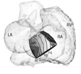 where A is the lead-field matrix describing the imaging properties of the volume conductor, x is the source vector to be found (epicardial potentials or transmembrane voltages) and y is the measured BSPM. The matrix A is computed from a sequence of forward computations. The procedure for transmembrane voltage reconstruction is described in more detail in [Skipa et al., 2002]. To solve the inverse problem, the improved Tikhonov 0-order regularization [Greensite, 1998] was applied. The experimental measurements were done in collaboration with St. Vincentius Hospital in Karlsruhe. The patient is 74 years old and has the weight of 76 kg. The diagnose of this patient was atrial flutter. The measurements of atrial excitation were performed as part of an RF-ablation procedure. The multielectrode basket catheter Constellation™ (Boston Scientific, Massachusetts, USA) was used to get 32-channel bipolar electrograms. The catheter was placed in the right atrium. The activation times at the site of every electrode pair were determined as the times of maximal deflection in the electrograms. The position of the catheter with respect to the surface measurement electrodes was determined from a pair of X-ray images made at different angles [de Boer, 2001]. The BSPMs were recorded with a 32-channel SynAmps™ amplifier (Neuroscan, El Paso, Texas, USA). The electrodes were localized from stereo video images taken before the measurements [de Boer, 2001]. 3. Results The recorded bipolar electrograms of atrial activation and the resulting activation times are shown in Fig. 1. The isochrones are shown on the surface in place of the basket catheter. The epicardial potentials and transmembrane voltages were reconstructed for the whole period of atrial activation. Several time instants corresponding to the activation times from Fig. 1 are shown in Figs. 2 and 3. Figure 1. 5 bipolar electrograms (left) and the activation times (right) for one cycle of atrial activation. Figure 2. Reconstructed epicardial potentials during atrial activation. Dark areas correspond to lower potential, light areas corrspond to higher potential. Figure 3. Reconstructed transmembrane voltages for atrial activation. Light areas correspond to depolarized tissue, dark areas corrspond to repolarized tissue. 4. Discussion The time course of the reconstructed epicardial potentials and transmembrane voltages shows approximate correspondence with the measured activation times. The work presents the experimental procedure to validate the results of cardiac source imaging. The future work will include further improvement of measurement and signal processing techniques. References de Boer I. Methoden zur Bestimmung von dreidimensionalen intrakardialen und extrakorporalen Elektrodenpositionen. PhD thesis. Universität Karlsruhe (TH), 2001. Greensite F. Second order approximation of the pseudoinverse for operator deconvolutions and families of ill-posed problems. SIAM Journal on Applied Mathematics, 59(1): 1-16, 1998. Skipa O, Nalbach M, Sachse F, Werner C, Dössel O. Transmembrane potential reconstruction in anisotropic heart model. In proceedings of the 29th International Congress on Electrocardiology and 4th International Conference on Bioelectromagnetism. International Journal of Bioelectromagnetism, 4(2): 17-18, 2002.