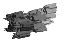 ![]() Figure 1. An example of a cluster of myocytes in the model. Each myocyte is irregularly shaped, though in such a way that they all fit together like a jig-saw puzzle. This illustration shows only the cells that form the intracellular space. The extracellular space is carved around these cells. In order to estimate the conductivity as accurately, as possible, we created a program that generated a cluster of irregular-shaped myocytes (see Fig. 1). The shapes were chosen in such a way that the average length and average cross-section of a myocyte equaled the values found in the literature. Further, we assumed that the intracellular specific conductivity was 0.3 S/m and the extracellular conductivity was 1.8 S/m. The gap junctions connecting the myocytes were assumed to be at the end-planes of the myocytes (in the planes perpendicular to the fiber direction). The resistance of the gap-junctions between two neighboring myocytes, with an overlap in cross-section of about half the average cross-section of a myocyte, was 2.5 MΩ. The overall tissue volume fraction occupied by the myocytes was 85 percent, the volume fraction occupied by the interstitial space was 10 percent, and the remaining 5 percent was occupied by a non-conducting capillary system. 3. Results