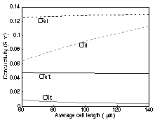 ![]() Figure 2. The estimated effective "bidomain" conductivities as a function of the myocyte length. These values were computed using a realistically shaped model of a cluster of 125 myocytes. Here, σel and σet are the effective extracellular conductivities in the longitudinal (along the fibers) and transverse directions, and σil and σit are the effective intracellular conductivities. Fig 2. shows the influence of the average cell length on the effective bulk conductivities. We found that the extracellular conductivities are hardly influenced by the cell length, whereas the intracellular conductivities depend on this parameter. The figure also shows that the anisotropy ratio for the intracellular conductivities (ranging between 10 and 25) significantly differs from the extracellular one (a value of 2.5). 4. Discussion Although many investigators consider the anisotropy ratios of the intra and extracellular spaces to be equal, the results of this realistically-shaped model seem to indicate otherwise. Not only did both anisotropy ratios differ, the intracellular one also depended on the actual length of the cells. In the near future, we hope to combine the results of this model with diffusion-tensor MR images and information regarding the actual ultrastructure throughout the heart in order to create a more realistic model of cardiac conductivity throughout the heart. An additional goal is to estimate the effects of ischemia on the bidomain conductivities and to estimate the resulting changes in epicardial and body surface potentials. References Johnston PR. Tissue conductivity and ST depression in a cylindrical left ventricle. Int J Bioelectromagnetism, 4(2), 61-62 2002.