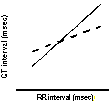Keywords: QT Interval; Heart Rate; Ambulatory ECG Monitoring; Arrhythmias; Long QT Syndromes 1. Introduction Prolonged ventricular repolarization, with abnormal configuration and increased dispersion of QT interval duration, has been associated with an increased risk of malignant arrhythmias in congenital and acquired conditions [1, 2]. The Q-T interval is modulated by multiple factors, such as heart rate level, circadian rhythm and autonomic nervous system activity that cannot fully be evaluated by a brief ECG tracing obtained in basal conditions [3]. Together with the long term analysis of heart rate variability, the long-term analysis of QT interval dynamicity can now be explored from 24-hour ECG Holter recordings by new computerized programs, in some cases already available for routine clinical use. However, the automatic measurement of QT interval by Holter techniques has several methodological limitations, due to the relatively low sampling rates utilized in Holter recordings, the shifting of the isoelectric baseline, the low signal-to-noise ratio, and the difficult determination of the T wave end. To overcome such problems, it has been proposed to utilize the interval from Q wave onset to T wave apex (QTapex), since in most cases T wave apex can be more accurately identified than T wave end (QTend) [4]. However, QTapex cannot be considered equivalent to the total QT duration, particularly in prolonged QT syndromes, where the QT prolongation may affect specifically the terminal components of the T wave [2, 5], whereas the early phase, QTapex, should mainly account for the rate dependency of ventricular repolarization [4]. Reliable long-term automatic measurements of both QTapex and QTend from Holter monitoring can be obtained by averaging procedures, in order to obtain a low-noise ECG signal; however averaging procedures necessarily ignore the instantaneous variations of the QT interval. In contrast, while the long-term beat-to-beat automatic analysis of QT duration can often be unreliable, short-term beat-to-beat procedures can explore the instantaneous fluctuations of QT duration and T wave morphology by sophisticated analyses requiring high quality ECG tracings in controlled conditions. 2. Long-Term Relation Between Ventricular Repolarization and Heart Rate Among the several methods proposed to evaluate the long-term modulation of ventricular repolarization by heart rate, one standard approach is to compute the linear regression between QT intervals and correspondent RR intervals, both on the entire 24-hours or on pre-selected time-periods. Of note, a steep slope may indicate a further prolongation of the QT interval at longer cycle lengths, whereas an adequate QT shortening at shorter cardiac cycles; conversely, a flat slope indicates that the QT interval is less dependent from the cardiac cycle, and it fails to shorten at shorter cycle (see Figure 1). Figure 1. Schematic representation of two linear regressions (steep, solid line, and flat, dashed line) expressing two possible different relation between QT and RR interval. Recent studies demonstrated that the QT-RR relation shows typical day-night differences [3], with flatter slope during night than during day-time. Also, the QT-RR relation is steeper in females than in males in normal adult subjects, in parallel with a longer duration of the corrected QT interval observed in adult females [6]. 3. Long-Term QT-RR Relation in Congenital Long QT Syndromes The QT-RR relation can be impaired in conditions of congenital and acquired prolonged ventricular repolarization [4, 7-10]. In patients with congenital long QT syndrome (LQTS), where at least three distinct genotypes (LQT1, LQT2, and LQT3) have been identified, typical gene-specific differences in rate dependency of QT duration have been recently demonstrated [7,8]. Preliminary findings indicate that patients with K+ channel abnormalities (Iks for LQT1 patients with KVLQT1 gene mutations located on chromosome 11, and Ikr for LQT2 with HERG gene-mutations on chromosome 7) may have impaired shortening of QT duration at fast heart rate, i.e. a flat slope of the QT-RR relation. In contrast, LQT3 patients, with SCN5A gene-mutations on chromosome 3, with impaired inactivation of cardiac sodium channels, tend to have further QT prolongation at longer cardiac cycles, i.e. a steep slope of the QT-RR relation [6, 7]. Of note, preliminary findings indicate that distinct patterns of circadian QT variability may also be present in LQTS patients with different genotypes. Patients with LQT3 genotype, with further QT prolongation at low heart rate, have longer corrected QT duration during sleep [11] that may account for the increased incidence of cardiac event during sleep and at rest observed in these patients [7]. In contrast, patients with LQT1 genotype appear to have longer QTc during day time, consistent with an impaired shortening of QT duration at fast heart rate that may account for the higher incidence of cardiac events during activity or stress more often observed among these patients. 4. Long-Term QT-RR Relation in Acquired Long QT Syndromes In patients with acquired prolonged ventricular repolarization, the heart rate dependency of QT duration may vary according with the drug and the cardiac condition provoking the QT prolongation. Conflicting information has so far been provided concerning the heart rate dependency of the moderate QT prolongation observed in patients following a myocardial infarction. Recently, patients with malignant arrhythmias were showed to have a steeper QT/RR slope than patients with coronary artery disease but with no history of malignant arrhythmias [12]. Of note, patients with coronary artery disease, when compared to normal subjects, may show lack of circadian modulation of the QT dynamics [12]. Abnormal circadian patterns of prolonged QT interval may be associated with an increased incidence of malignant arrhythmias [13] and sudden cardiac death after 