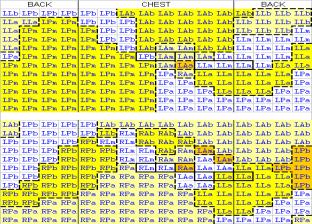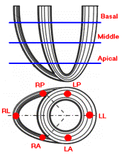 where: i and k indices of non-overlapping sub-regions assigned to one of the 18 MI locations j index of a surface unipolar lead. The above procedure was applied for QRST integral maps and for the QRS 3rd decile integrals. The first choice is optimal from the point of view activation propagation invariance, while the second one was proved to be optimal in a statistical study of patients with intact intraventricular conduction system (Geselowitz 1983, Kozmann et al. 1991) 3. Results Essentially the number of the observable source regions and the extension of the regions heavily depend on the location and dimension (characterized by the radius of the disk shape unexcitable tissue) of the MI. QRST integral maps are invariant to the simultaneous breakdown of the intraventricular conduction system, but the resolution in terms of the number of recognizable defects is suboptimal. The 3rd decile QRS maps (for R=25 MU) reveal the entire LV but only 3 RV locations while on QRST integral 7 LV and 7 RV locations distinguishable (Table 1.). The good result for LV sources is likely because in the 3rd decile interval the masking effect of the early right ventricular wall depolarization is rather limited. Usually the MIs positioned in the middle section are hardly observable. The maximal amplitudes of Dj(j) distributions grow linearly by increasing the radius of the infarction. If only one local source deficit is present, the location of the maximal negative departure from normal specifies dropout location, while the amplitude quantifies its extension. ![]() ![]() Figure 1. Left: Arrangement of simulated MI locations within the ventricles (similar for all the three levels).Right: Decision regions for radius 25MU (approx. 25 mm) for the 3rd decile QRS (upper) and for the QRST integral map (lower). Codes show the detectable locations in terms of the source representation shown in the left. V1-V6 positions are shown in heavy line boxes. One cell represents one lead of the 192 lead system. Table 1. Number of observable MIs vs. the radius of MI (in modeling units).