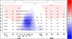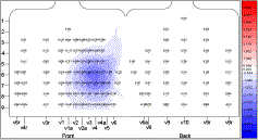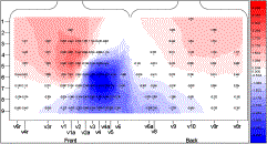 The model in this study had 117 surface points with 11732 source nodes in the heart area that had a lead vector calculated. The source model used was dipole. A dipole can represent a uniform double layer of various sizes and a larger uniform double layer can be divided into smaller sections and represented as multiple dipoles. In this study all dipoles were equal in strength. Dipoles were used to approximate a double layer representing ischemic area in myocardium. The normal activity of the heart itself is not present and only the contribution of the source dipoles representing the ischemic border area was simulated. The simulations were performed with multiple dipoles, the number ranging from 147 to 768 depending on the size of the ischemia. The ischemia was located to origin from the inferior apex of the left chamber and it spreads out to the right chamber region as the size gets larger. 3. Results Figure 1 shows the simulated BSPMs. The size was increased in non-constant steps, which is due to the FDM model and software restrictions. Figure 1 shows that the effect of ischemia causes rise in potentials on upper parts of the torso. In (a) the ischemia is represented by 147 dipoles and covering approximately 7% of the whole heart area. In (b) the number of dipoles is increased to 320 as the size is increased to 15% of the whole heart area. In (c) the area has spread to be large enough to cover parts of the right chamber surface and it is represented in total of 528 dipoles while the ischemia covers approximately 30% of the of the whole heart area. In (d) the size of the ischemia is almost half of the heart and is approximated with 768 dipoles. Positive potentials appear to the maps as the area gets large enough, in this simulation approx. 15% of the whole heart area.