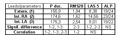 The aim of the study was to determine value of SA intra-atrial signals for technique for recognition of atrial late potentials and its comparison to conventional technique. Methods. Intra-atrial signals were recorded in 24 pts with interatrial conduction disturbances during implantation of BiA pacemaker, using bipolar leads (designed for permanent pacing) located in RAA, LRA and CS. Before implantation standard surface SA ECG from orthogonal Frank leads was obtained. We analyzed following parameters: P wave duration (Pdur), RMS20 and LAS5 and presence of ALP criteria in records obtained from external as well as right- and left intra-atrial leads. Conclusion. Intra-atrial SA IEGM yields accurate data for ALP study, mostly due to better signal quality and QRS discrimination. P duration and RMS20 seem to be substantial parameters with good correlation between external SA ECG and internal SA IEGM, however the last method requires establishing definite evaluation criteria.