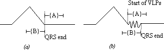 aged 47 The high resolution ECGs were recorded using a commercial Simens-Elema Megacart®. A bipolar, orthogonal X, Y and Z lead system was used and a sample of 10 minutes raw ECG data with 12-bit resolution at 2 kHz was stored for analysis. The typical segment used in the spectral analysis is depicted as segment {A} in Fig. 1. The presence of VLPs can be demonstrated by a larger high frequency component. However, VLPs are to some extent mixed with the terminal normal QRS complex. Therefore, it is difficult to determine the onset of VLPs. For this reason, the starting point of VLPs was not chosen as the reference, the major segment selected for spectral analysis was the 40 ms segment before the QRS ends (segment {B} in Fig.1.). This method can evaluate the total amount of high frequency amplitude of terminal 40 ms QRS complex. The mean RMS40 of VT patients has been reported to be significantly smaller than normal due to the presence of VLPs in VT patients. Hence, this should lead to a smaller high frequency component in segment {B}. The 80 ms length of Blackman Harris window with 92 dB side lobe was used to obtain signals from the terminal 40 ms QRS complex in order to prevent the edge discontinuity. The starting point of this window was set at 60 ms before the QRS ends. After windowing, this 80 ms signal was zero-padded to 256 ms. The spectral calculation based on fast Fourier Transform (FFT) was performed by the definition of discrete Fourier transformation (DFT) [Oppenheim and Schafer, 1989]. The composite spectrum of XYZ leads was performed by the method of spatial vector. The root-mean-square area (RMSA) is defined as RMS value of the spectral amplitude in 40 to 250 Hz band. The RMS area ratio (RMSAR) which is defined as 40 to 250 Hz RMS area / 0 to 250 Hz RMS area was used to evaluate the high frequency components. Data were presented as mean ![]() Figure 5. Illustrations to dicpict the detection of VLPs in the late QRS complex. (a) QRS complex without VLPs, (b) QRS complex with VLPs 3. Results There were significant differences of all time domain parameters between VT patients and normals. The RMS area and RMS area ratio of VT patients were also significantly lower than normals. Table 1. Summary of results in time domain and frequency domain SAECG analysis.