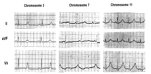 Figure 1. T wave patterns in LQT1, LQT2, and LQT3 Carriers. The QT parameters (QTonsetc, QTpeakc, QTc) were most prolonged among the LQT3 carriers. T amplitude was smallest in LQT2 carriers and T wave duration was longest in LQT1 carriers. This observation set the stage for further phenotypic characterization of LQTS patients and flat, notched T wave is now recognized as a typical feature of LQT2. Remote peaked T wave with long (and sometimes somewhat elevated) ST segment is characteristic for LQT3. LQT1 carriers usually show normal looking T wave however with prolonged T wave duration almost eliminating ST segment. It is important to add that subsequent analyses demonstrated that T wave patterns vary substantially within genetic type of LQTS and also vary depending on age of studied individuals. 3. Differential Dynamics of Repolarization by Genotype QT duration and T wave morphology changes in response to variety of stimuli and conditions, which may include exercise, emotion, and action of some drugs. Differences in the sensitivity of the genotype of the congenital long QT syndrome to sympathetic stimulation (administration of epinephrine) has been studied by Shimizu and coworkers. They found that the QTc was prolonged and remained prolonged at steady state conditions of epinephrine in LQT1 patients [Noda et al. 2002]. Epinephrine also prolonged the QTc at peak of epinephrine in LQT2 patients, but this shortened to baseline levels at steady state. The QTc was much less prolonged at peak of epinephrine in LQT3 and controls than in LQT1 and LQT2 patients, and shortened to the baseline levels at steady state. This observation was further extended in a subsequent study from the same group where LQT1 patients with different penetrance of the disorder were studied [Shimizu 2003]. LQT1 carriers with borderline QTc could be identified based on response to epinephrine infusion causing substantial QTc prolongation with changes in repolarization morphology. Furthermore, symptomatic patients were presenting with more prolonged QTc in response to epinephrine than asymptomatic patients. Recently Takenaka et al. [2003] reported that QTc and Tpec were significantly prolonged during exercise in LQT1 patients (599+/-54 ms and 215+/-46 ms, respectively) with morphological change into a broad-based T-wave pattern. In contrast, exercise produced a prominent notch on the descending limb of the T wave, with no significant changes in the QTc and Tpec (502+/-82 ms and 163+/-86 ms: n=19) in LQT2 patients. Tpe interval increases during exercise in LQT1 but not in LQT2, which may partially account for the finding that fatal cardiac events in LQT1 are more often associated with exercise. Repolarization duration and morphology could also be changed differentially by beta-blocker therapy in LQT1 and LQT patients, as demonstrated in body surface mapping [Shimizu 2002]. They found that beta-blockade under normal sympathetic tone produces a greater decrease in TDR in the LQT1 form than in the LQT2 form, explaining the superior effectiveness of beta-blockers in LQT1 versus LQT2. Beta-blockers also suppress the influence of sympathetic stimulation in increasing TDR and SDR equally in LQT1 and LQT2 syndrome. 4. Summary Careful analysis of repolarization duration and morphology in static or dynamic conditions provides vast opportunity to enhance process of diagnosing and risk stratification of LQTS patients. Distinct resting and dynamic ECG patterns are observed in different genetic types of LQTS and this phenotypic presentation allows identifying affected individuals as well as patients prone to develop arrhythmias. References Moss AJ, Schwartz PJ, Crampton RS: The long QT syndrome. Prospective longitudinal study of 328 families. Circulation 1991; 84:1136-44 Moss AJ, Zareba W, Benhorin J, Locati EH, Hall WJ, Robinson JL, Schwartz, PJ, Towbin JA, Vincent GM, Lehmann MH, Keating MT, MacCluer JW, Timothy KW. Electrocardiographic T-wave patterns in genetically distinct forms of the hereditary long QT syndrome. Circulation 1995;92:2929-2934. Noda T, Takaki H, Kurita T, Suyama K, Nagaya N, Taguchi A, Aihara N, Kamakura S, Sunagawa K, Nakamura K, Ohe T, Horie M, Napolitano C, Towbin JA, Priori SG, Shimizu W. Gene-specific response of dynamic ventricular repolarization to sympathetic stimulation in LQT1, LQT2 and LQT3 forms of congenital long QT syndrome. Eur Heart J 2002;23:975-83 Shimizu W, Noda T, Takaki H, Kurita T, Nagaya N, Satomi K, Suyama K, Aihara N, Kamakura S, Sunagawa K, Echigo S, Nakamura K, Ohe T, Towbin JA, Napolitano C, Priori SG. Epinephrine unmasks latent mutation carriers with LQT1 form of congenital long-QT syndrome. J Am Coll Cardiol 2003;41:633-42. Shimizu W, Tanabe Y, Aiba T, Inagaki M, Kurita T, Suyama K, Nagaya N, Taguchi A, Aihara N, Sunagawa K, Nakamura K, Ohe T, Towbin JA, Priori SG, Kamakura S. Differential effects of beta-blockade on dispersion of repolarization in the absence and presence of sympathetic stimulation between the LQT1 and LQT2 forms of congenital long QT syndrome. J Am Coll Cardiol 2002;39:1984-91 Splawski Splawski I, Shen J, Timothy KW, Lehmann MH, Priori S, Robinson JL, Moss AJ, Schwartz PJ, Towbin JA, Vincent GM, Keating MT. Spectrum of mutations in long-QT syndrome genes. KVLQT1, HERG, SCN5A, KCNE1, and KCNE2. Circulation 2000 Sep 5;102(10):1178-85 Takenaka K, Tomohiko A, Shimizu W, Kobori A, Tomonori N, Otani H, Kubota T, Takaki H, Kamakura S, Horie M. Exercise stress test amplifies genotype-phenotype correlation in the LQT1 and LQT2 forms of the long-QT syndrome. Circulation 2003;107:838-844. Zareba W, Moss AJ, Schwartz PJ, Vincent GM, Robinson JL, Priori SG, Benhorin J, Locati EH, Towbin JA, Keating MT, Lehmann MH, Hall WJ:. Influence of the genotype on the clinical course of the long QT syndrome. N Engl J Med 1998;339:960-5.