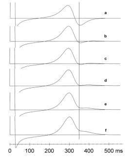 where α is the angle between D and L. Each dipole has its own lead vector and will, therefore, make a differently weighted contribution to VP. The closer P is to the source D, the larger L tends to be; in addition, VP is maximal for α = 0, but zero for lead vectors perpendicular to the dipole axis. 3. Results Let us first assume that all lead vectors are of equal strength and point in the same direction as the sources (i.e., cos α = 1). The calculated VP follows the pattern of Fig. 2a, which electrocardiogram can be described as a biphasic T wave. ![]() Figure 2. Computed repolarisation patterns in point P: (a) Equal lead strengths for all layers; (b-f) Differential lead strengths. The distance of P to the epicardium is varied from 8 cm (b) to 4 cm (f) in 1 cm steps. The vertical marker is at 350 ms, as in figure 1. However, the lead vectors are not of equal strength since they are dependent on the location of the exploratory point P in relation to the sources in the myocardium. The thickness of the ventricular wall (12 mm in our model) is not negligible in relation to the distance between the epicardium and the electrode locations on the body surface, in particular the chest leads. In a homogeneous infinite conducting medium the lead strength is inversely proportional to the square of the distance of the source to the measuring point. Figures 2b to 2f illustrate the effect of varying the distance of P to the epicardium on the appearance of the U wave. At 8 cm (Fig. 2b) the lead strengths increase exponentially from 1 to 1.26 from endocardium to epicardium, assuming P in the axis of the dipoles (α = 0°). The terminal part of the repolarisation appears isoelectric. At smaller distances this terminal part is seen to rise. At 6 cm (lead strengths from 1 to 1.35), there is an unmistakable U wave (Fig. 2d). At 4 cm (lead strengths from 1 to 1.53) the prominent U wave of Fig. 2f arises. 4. Discussion With equal lead vectors at any time instant the voltage at P is the sum of all dipole strengths |D1|, …, |D11|, times a constant. These strengths are determined, with a certain common proportionality factor, by the potential differences between each pair of adjacent APs. Thus, VP follows from (AP1-AP2) + (AP2-AP3) + … + (AP11-AP12), which simply reduces to AP1–AP12. Consequently, without lead differentials a body surface potential will only show the differences between endocardial and epicardial potential course. Unless the endo- and epicardial repolarisation curves are of very unusual appearance their differences will not result in the double-humped deflection that ECG tradition has taught us to label as a separate T wave and U wave. If, on the other hand, lead vector differences are applied, the divergence in AP durations of the mid-myocardial layers is not nullified and a U wave appears. As Antzelevitch and coworkers [Antzelevitch and Sicouri, 1994; Nesterenko and Antzelevitch, 1992] proposed it is the delayed repolarization of the M cells that is a condition for the appearance of the U wave, but it requires lead vector differentials to actually produce them. The larger the lead vector differentials, the more conspicuous the U waves, such as in the central chest leads. The differential lead vector model as presented here gives a different meaning to the definition of the end of the T wave. Fundamentally there is a continuum between T and U. What is generally regarded as the end of T coincides more or less with the end of endocardial repolarisation. The repolarisation of the bulk of the myocardium is only completed at the end of U. T and U together are the resultant of the same process, i.e., the total repolarisation of the ventricular myocardium. This means that our ideas about QT duration and prolongation, whether drug-induced or congenital, have to be reassessed and that the approach to drug safety testing will need to be reconsidered. References Antzelevitch C, Sicouri S. Clinical relevance of cardiac arrhythmias generated by afterdepolarisations. Role of M cells in the generation of U waves, triggered activity and torsades de pointes. Journal of the American College of Cardiology, 23, 259-277, 1994. Di Bernardo D, Murray A. Origin on the electrocardiogram of U-waves and abnormal U-wave inversion. Cardiovascular Research, 53, 202-208, 2002. Drouin, E., Charpentier, F., Gauthier, C, Laurent, K. & Le Marec, H. Electrophysiological characteristics of cells spanning the left ventricular wall of human heart: evidence for the presence of M cells. Journal of the American College of Cardiology, 26, 185-192, 1995. Einthoven W. Le télécardiogramme. Archives International de Physiologicue, 4, 132-164, 1906. Hoffman BF, Cranefield PF. Electrophysiology of the Heart. McGraw-Hill, New York, 1960. Nesterenko VV, Antzelevitch C. Simulation of the electrocardiographic U wave in heterogeneous myocardium: effect of local junctional resistance. In proceedings of Computers in Cardiology, 1992, 43-46. Surawicz B. U wave: facts, hypotheses, misconceptions, and misnomers. Journal of Cardiovascular Electrophysiology, 9, 1117-1128, 1998. Van Dam RT, Janse MJ. Activation of the heart, in Comprehensive Electrocardiology. Macfarlane PW, Lawrie TDV, Editors. Pergamon, New York, 101-128. Wohlfart B. A simple model for demonstration of ST-T changes in ECG. European Heart Journal, 9, 409-416, 1987. Wu J, Wu J, Zipes DP. Early afterdepolarisations, U waves, and Torsade de Pointes. Circulation, 105, 675-676, 2002.
