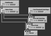 Figure 1.Programming, modeling, and visualization in BioPSE. In (a) we see a snapshot of the BioPSE dataflow programming interface. Users can interactively construct programs by instantiating modules, and passing input and output data between the modules through dataflow pipes. In this example we have built a small program for interactively changing the conductivity of specific regions of the mouse heart model in order to simulate ischemic regions, as shown in (b). In (c) we see a volume rendering of the MRI heart model data used in this study; in (d) we visualize the smooth rotation of the primary fiber orientations, as sampled through the ventricular walls. 2. Methods As shown in Fig. 1a, BioPSE provides a visual dataflow programming environment interface, allowing for the rapid development of bioelectric field applications. With dataflow, the program’s data is passed from upstream modules to downstream modules through color-coded data-pipes. The modules provide a rich language of algorithms (e.g. model filters, finite element approximations, linear solvers, rendering methods, etc.), while the data-pipes control the flow of data between modules. For this study, we used a diffusion-weighted MRI scan of a mouse heart, scanned at 75-micron resolution. This model was pre-segmented during the conversion from diffusion-encoded channels to conductivity tensors [Hsu et al, 1998], resulting in a regularly gridded 1283 volume of measured diffusion tensors, where background voxels were tagged with null tensors. We imported this raw volume of data into BioPSE and clipped out the atria using an interactive tool like that shown in Fig. 1b. We then ran a connected-component algorithm to cull the ventricular cavities and the background from the myocardium. The resulting mouse heart model consisted of 225 236 nodes, as shown in the volume rendering (with the ventricular cavities excluded) in Fig. 1c. Exploring the local fiber structure of our model, we placed BioPSE virtual probes through the left and right ventricular walls. With these probes we sampled the fibers at regularly spaced intervals through the wall, and were able to verify the existence of smoothly rotating primary fiber orientations, as shown rendered in Fig. 1d. Having completed the geometric modeling of the data, we then used BioPSE to set up the simulation parameters. Specifically, we constructed a BioPSE dataflow network to: 1) reorder the nodes using the Cuthill-McKee algorithm to minimize matrix bandwidth; 2) interactively identify the stimulation site for pacing; 3) assign conductivity values throughout the domain; 4) construct the bidomain stiffness matrices for the hexahedral volume conductor model; and 5) save out the results as CARDIOWAVE input files. We then used CARDIOWAVE with a semi-implicit Crank-Nicholson scheme to simulate 100 ms of activation at 2.0 ms time steps. The propagation simulation required 6 hours of CPU time on 11 processors at the North Carolina Supercomputing Center. 3. Results Importing the CARDIOWAVE simulation results into BioPSE, the activation times and time-dependent voltage potential distribution are visualized on the epicardial surface. Fig. 2a shows the isochrone activation contours: activation was gated upon the upstroke reaching –60 mV; the entire heart took approximately 24 ms to activate. Fig. 2b shows the transmembrane potentials at 6.5 ms after stimulation; Fig. 2c shows the extracellular potentials at that same time instant.
