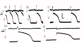 Keywords: Fibrillation; Transmembrane Potentials; Deep Cooling 1. Introduction It is known the descent of temperature of a body less than 26-280C can lead to the ventricular fibrillation (V.M.Pokrovsky et al., 1984) but the process of ventricular self-defibrillation is not studied by low temperature of a body. The aim of the present study was to investigate the process of spontaneous ventricular fibrillation and self-defibrillation in deep body cooling. 2. Material and Methods The guinea-pigs were cooled in the water-ice bath until to +4oC of a body. For control of the TB was used a rectal thermometer. “Swimming” glass microelectrodes were used for recording of transmembrane potentials of ventricular contractile cardiac cells in fibrillation induced by electrical current. 3. Results and Discussion The resting potential (RP) was decreased significantly (p<0.05) if the TB was less 200C. The amplitude of action potential (AP) was decreased if the TB was less 250C and according to it the overshoot was decreased too. The increase of action potential duration (APD) was according to the heart rhythm inhibition (Fig. 1, Table 1). Figure 1. Electrical activity of cardiomyocytes of the left ventricle. Non-stop registration by the deep cooling of a body. 1 –ECG, 2 – AP. 50 mV, 50 ms. Temperature: A – 370, B - 330, C - 250, D – 200, E – 170. We registered only ventricular asystolia when the TB was less than 12-150C. The electrical threshold of VF was increased from 1.6 V until 300 V by the descent of the TB until 80 C. Table 1.