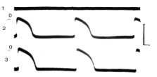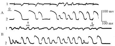 We could model the ventricular fibrillation if we used the overthreshold irritation. The electrical activity of cardiac cells by the low temperature of the body was the same as in control experiments (Fig.2) but the frequency of APs was lower and the depolarization of cardiomyocytes was not more than 5-7 mV by temperature 250C (instead 30-35 mV in control experiments). Figure 2. Fibrillation and self-defibrillation by the temperature +250 C. A-B –non-stop registration. On-off –influence of electrical current. 1- ECG, 2- AP. A comparative research of transmembrane potentials of cardiomyocytes belonging to the left and the right ventricles demonstrated that the difference in the APD appeared, when the TB was less than 18-200C, and the mainly expressed changes were in the cardiomyocytes belonging to the right ventricle (Fig.3). Figure 3. Electrical activity of cardiomyocytes of the left (2) and right (3) ventricles. 1 – ECG. Temperature +170 C, 100 mV, 100 ms. Probably, it was according to the fact, that the blood, which flows to the right ventricle, is colder than one flows to the left ventricle (Lloyd and Mitchel, 1974). So, one of the causes of the absence of spontaneous fibrillation by hypothermia was the decrease of the excitability of myocardium in spite of the fact that there appeared the electrophysiological heterogeneity. Acknowledgements Work supported by grant of RFBR № 01-04-48201. References Pokrovsky V.M., Sheich-Zade Y.R., Vovereit V.V. A heart by hypothermia. Nauka, Moscow, 1984, 141. Lloyd E. and Mitchel B. Factors affering of ventricular fibrillation on hypothermia. Lancet.1974., v.2, N7892, p.1294