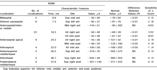 P<0.05. 3.1. What Does the Standard 12-Lead ECG Reveal in NQMI? According to BSPM features, the potential losses of different regions resulted in minor changes at different times during the QRS interval. The initial depolarization was involved only in cases of midseptal and anterior paraseptal potential losses: a slight r-wave reduction was revealed in leads V1 and V2. However, true pathological Q waves were seen in the leads situated above them (according to the leads V1' and V2'). For anteroseptal/inferior middle and anteroseptal apical potential losses, the r wave in leads V1 to V3 was narrower, similar to the right-sided leads. For inferoapical and inferobasal sites, a notch could appear in the inferior ECG leads. For the anterosuperior middle/basal sites, an r-wave reduction of varying degrees could be seen in leads V2 to V4. For posterolateral middle/basal sites, the r wave in leads V1 and V2 was wider and a little taller, and the real posterior leads had a wider Q wave because of the persistence of the back-sided minimum. 3.2. How Were the NQMI Features Revealed in QMI? The initial superior minimum of the midseptal and anterior paraseptal potential loss appeared in anterior QMI where the septum was involved according to the ECG (QS in leads V1 and V2, 21 of 32 cases). In extensive anterior QMI, the isopotential maps showed an extended right anterior negativity that did not allow us to discriminate among anteroseptal/inferior middle, anteroseptal apical, and anterosuperior middle/basal lesions (12 of 32 cases). The breakthrough arrived from above in 6 anterior QMI cases as in the anterosuperior middle/basal NQMI lesion. The clearly inferior QMI (22 of 38) cases showed similar inferior negativity as was seen in inferoapical NQMI. The characteristic right upper late negativity of the inferior basal NQMI location was not revealed in QMI cases. The characteristic late, back-sided minimum of posterolateral basal NQMI was even later in 10 cases with a tall R wave in lead V2. In summary, some of the pathological NQMI changes appeared in QMI, but in general, the larger extent of the necrosis masked the subtle pathological signs of the smaller regions. References 1. Goldberg RJ, Gore JM, Alpert JS, Dalen JE. Non-Q wave myocardial infarction: recent changes in occurrence and prognosis: a community-wide perspective. Am Heart J. 1987;113:273. 2. Kornreich F, Montague TJ, Rautaharju PM. Identification of first acute Q wave and non-Q-wave myocardial infarction by multivariate analysis of body surface potential maps. Circulation. 1991;84:2442–2453. 3. Arvan S, Varat MA. Two-dimensional echocardiography versus surface electrocardiography for the diagnosis of acute non-Q-wave myocardial infarction. Am Heart J. 1985;110:44–49. 4. Wahl JM, Hakki AH, Iskandrian AS, Yacone L. Scintigraphic characterization of Q wave and non-Q-wave acute myocardial infarction. Am Heart J. 1985;109:769–775. 5. Osugi J, Ohta T, Toyama J, Takatsu F, Nagaya T, Yamada K. Body surface isopotential maps in old inferior myocardial infarction undetectable by 12 lead electrocardiogram. J Electrocardiol. 1984;17:55–62. 6. Hirai M, Ohta T, Kinoshita A, Toyama J, Nagaya T, Yamada K. Body surface isopotential maps in old anterior myocardial infarction undetectable by 12 lead electrocardiograms. Am Heart J. 1984;108:975–982. 7. De Ambroggi L, Bertoni T, Rabbia C, Landolina M. Body surface potential maps in old inferior myocardial infarction: assessment of diagnostic criteria. J Electrocardiol. 1986;19:225–234. 8. De Ambroggi L, Bertoni T, Breghi M, Marconi M, Mosca M. Diagnostic value of body surface potential mapping in old anterior non-Q myocardial infarction. J Electrocardiol. 1988;21:321–329. 9. Vincent GM, Abildskov JA, Burgess MJ, Millar K, Lux RL, Wyatt RF. Diagnosis of old myocardial infarction by body surface isopotential mapping. Am J Cardiol. 1977;39:510–515. 10. Savard P, Ackaoui A, Gulrajani R, Nadeau RA, Roberge FA, Guardo R, Dubé B. Localization of cardiac ectopic activity in man by a single moving dipole: comparison of different computation techniques. J Electrocardiol. 1985;18:211–222. 11. Medvegy M, Préda I, Savard P, Pintér A, Tremblay G, Nasmith JB, Palisaitis D, Nadeau RA. New body surface isopotential map evaluation method to detect minor potential losses in non-Q-wave myocardial infarction. Circulation. 2000; 101:1115-1121.
