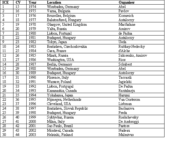 Figure 3. Opening ceremony at the Minsk congress in 1985. In 1982, the Congress was held in Japan marking the first time that the Far East had hosted such a meeting. There is very significant interest in electrocardiology in that part of the world as described elsewhere [Hiraoka, 2003]. Indeed, the Young Investigator’s Award at the annual congress was recently named in memory of the late Professor Kenichi Harumi, a former President of the Council from Tokyo, who died recently. The structure of the congresses had always been somewhat informal as Professor Rijlant, who was the father of the Congress, preferred not to have too formal an organizational structure. In 1974, at the first congress, it was decided to form a so-called Permanent Committee, which met annually (see Figure 4) but at that time there was no secretary or president. Eventually, it was thought that the term Permanent Committee was inappropriate and in 1983 at the 10th International Congress in Bratislava, following the death of Professor Rijlant, the International Council on Electrocardiology was formed. This allowed the creation of a more formal committee structure with a president. The first president of the society fittingly was Ruttkay Nedecky who had participated in the first colloquium vectorcardiographicum in 1960. Table 2 shows the locations of all of the congresses from 1974 until the present. Table 3 shows the list of presidents of the Council from 1983 until the present. There was always a first class social programme associated with every meeting, reflecting the local culture and traditions. Many spouses and partners of delegates who attended the meetings also participated in separate accompanying persons programs and often saw more of the local environment than did the delegates! Many friendships sprung up across the globe and are still in existence today. Sadly, not all of those who attended earlier meetings are still alive today and many great figures no longer grace the congresses with their presence. Table 2.