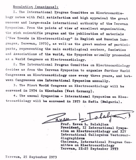 The table conceals some interesting facts. It can be seen, particularly from the period 1967 onwards, that the colloquium was held sometimes in Western Europe or in North America and sometimes in Eastern Europe. The political map at the time, as is well known, had the so called "Iron Curtain" in place between Eastern and Western Europe so that it was not always easy for participants to attend the colloquia every year. Nevertheless, those in Eastern Europe were always very grateful for the support from those who traveled from the West while in return, meetings in the West afforded colleagues from Eastern Europe the very significant opportunity to experience scientific exchange in a different environment. In 1972, following an earlier suggestion of Professor Zaven Dolabjian from Yerevan, the colloquium had its name changed to Symposium on Electrocardiology, which reflected the broadening of interest of the meeting. In the following year, it was suggested somewhat ambitiously that the International Symposium on Electrocardiology should change its name to the World Congress on Electrocardiology. The original resolution of the Program Committee can be seen in Fig 1. However, the more modest title of International Congress on Electrocardiology was subsequently adopted. Figure 1. The resolution signed in Yerevan, Armenia in September 1973 suggesting the change of name of the International Symposium on Electrocardiology to International (or even World !) Congress on Electrocardiology. I can say from a personal point of view that the opportunity to travel to the various cities where the Colloquium Vectorcardiographicum was held was a wonderful bonus on top of the actual science. Most participants would have their own stories to tell in relation to their experiences of traveling and participating in the colloquia. By and large, the colloquia were usually held with English as the main language but certainly in Vienna in 1967, for example, many papers were presented in German. This author then studied the language for one year on the basis that it was going to be necessary to understand German in order to enhance attendance at this meeting. However, every colloquium (and congress) thereafter was held in English! There were many difficulties because it was not always easy for Eastern Europeans to obtain financial support, not only for travel but for subsistence, when participating in a meeting in the West and often the organizers had to do their utmost to find adequate financial support. However, there was a tremendous bond of friendship between all of those who participated in the meetings at that time. Scientifically, there was a very high level of presentation of research as this was one of the few groups worldwide that had a major interest in electrocardiography. Not many cardiologists nowadays have the breadth of understanding of electrocardiography that the participants in the colloquia had. PART II:1974 – 2003 The first International Congress on Electrocardiology was held in Wiesbaden in 1974 and every year since then, there has been an International Congress. Occasionally, the Congress has been combined with the meeting of another society such as in 2002 in Montreal when there was a joint meeting with the International Society of Bioelectromagnetism. In addition, there have been sessions organized by the International Society of Computerized Electrocardiology as in Poland in 1991 and more frequently by the International Society for Holter and Non Invasive Electrocardiology. From 1974 – 1982, there was always an annual meeting of the Program Committee (see Figure 2) to plan ahead. Figure 2. Some of the “Permanent” or Program Committee meeting in Lisbon, 1981. (L-R) Taccardi, Arsenescu, Harumi, Pipberger, Macfarlane, Ruttkay-Nedecky, D’Alche. From the period 1969 to 1993 a number of satellite symposia were held. On occasions this was to enable those in the East who had difficulty in traveling to the West to meet together in order to maintain their interests in the topic. On other occasions, the satellite symposia dealt with a specific topic such as body surface mapping. Details can be found in an earlier review of the history of the congresses [Ruttkay-Nedecky and Macfarlane, 1994]. In terms of location, the congress continued to rotate between Eastern Europe (see Figure 3 for example) and the West until the 1990's when consecutive conferences in the West were held from 1992 until 1996. Table 2 shows a list of locations and organizers. The Iron Curtain had effectively fallen in late 1989 and indeed the meeting that year in Budapest was notable for the fact that many refugees were fleeing from Eastern Germany into Hungary and staying very close the conference site.