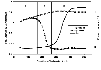 The multichannel generation of multi-frequency excitations simultaneously is a means to reduce the number of needed switchings in the multiplexer and to obtain reliable results during a short measurement cycle. Generation of the simultaneous multi-frequency excitation requires application of digital waveform synthesizers and, unfortunately, also a far better signal resolution and a more complicated signal processing of response signals. Only about 16- to 20-bit digitizing resolution and sophisticated digital signal processing (DSP) means can ensure demodulation of every frequency component of the multifrequency response separately and practically simultaneously for getting near to real-time presentation [Min et al., 1999]. 2.3. Detection of Ischemia Caused Cardiac Tissue Deterioration by Impedance Spectroscopy With the interruption of the blood supply to organs (ischemia), oxygen and substrates rich in energy are no longer delivered to the tissue and the metabolic products are no longer removed. The tissue is increasingly injured and finally damaged to such an extent that viability goes lost. Because tissue structures (extra- and intracellular compartments, membranes) affect the electric current conduction (Fig.1a), measurements of tissue impedance spectra (Fig.1b) during ischemia will reflect the progressive deterioration of the tissue and determine reliably when the organ runs into the critical range before the irreversible loss of life. In the following example impedance spectroscopic measurements in myocardial tissue during ischemia (animal experiment, for details see Gersing, 1998) is presented. After isolation from the circulation, the heart muscle has been perfused with a cold cardioplegic solution for 8 minutes in order to slow down the injurious processes in tissue. For impedance measurements an excised sample was incubated in a temperature controlled chamber at 25°C. ![]() Fig.4 shows the relative changes in conductance at 100 Hz and 10 MHz during ischemia and the course of the contraction index, a measure of the contraction of the muscle cells caused by deficiency in energy (rigor mortis). At high frequency the conductance increases almost linearly up to about 300 minutes, at low frequency after about 150 minutes the conductance decreases rapidly to a lower plateau (260 minutes). At that time muscle cells start to contract. Conductance at high frequency is a measure of the total amount of mobile ions in the tissue, which increases as long as the metabolism is active, i.e. up to 300 minutes. Conductance (real part of admittance) at low frequency (reflecting the extracellular compartment, the conductance of the cell membranes and the state of the gap junctions) shows a rapid decrease after 150 minutes indicating closing gap junctions [Kehrer et al., 1990]. When they are closed the contracture begins. 3. Discussion and Conclusions The result of ischemia studies shows that an organ can be successfully resuscitated up to the decline of the conductance at low frequency. Later on, resuscitation will be possible with an increasing time for recreation, but after the closure of the gap junctions' revivability is normally lost. From the results it can be concluded, that impedance spectroscopy is an appropriate method (and harmless to the tissue) for determining the state of organs during ischemia. ([Schaefer et al., 2002], with a comprehensive list of references). The impedance measurement at several frequencies simultaneously widens perspectives of cardiac monitoring in vivo. Although one might instinctively prefer non-invasive implementations of the technology, this should not limit creativity and applications. Clearly, in several applications invasive electrode systems do not add to the degree of invasiveness inferred by other medical actions, e.g. intracardiac catheters for pressure measurements or pacemaker electrodes. One might therefore predict further development in the direction of getting as close as possible to the signal source in order to obtain highest quality data for diagnose/characterization of tissue alteration or monitoring of cardiac function, without the non-invasive limitation/restriction. On the other hand, non-invasive technologies for cheap and simple monitoring of vital parameters will have its applications, although there will always be a risk of confounding data unless verified by other methods. Acknowledgements This work was supported by Estonian Science Foundation, grant no. 4859, the Karolinska Institute, Sweden, St. Jude Medical AB, USA-Sweden, and Deutsche Forschungsgemeinschaft. References Åberg P, Nicander I, Holmgren U, Geladi P, Ollmar S. Assessment of skin lesions and skin cancer using simple electrical impedance indices. Skin Res Technol, 2003 (in press). Anderson FA. Impedance plethysmography, in Encyclopedia of Medical Devices and Instrumentation. Webster JG, Editor. John Wiley & Sons, New York, 1988, 111-122. Baan J, Jong TTA, Kerkhof PLM, Moene RJ, van Dijk AD, van der Welde ET, Koops J. Continuous stroke volume and cardiac output from intra-ventricular dimensions obtained with impedance catheter. Cardiovasc Res, 15: 328-334, 1981. Baura G. System Theory and Practical Applications of Biomedical Signals, Ch. 6: Improved Impedance Cardiography. IEEE Press, Wiley, New Jersey, 2002. Cornish BH, Thomas BJ, Ward LC. Improved prediction of extracellular and total body water using impedance loci generated by multiple frequency bioelectrical impedance analysis. Phys Med Biol, 38: 337-346, 1993. Ericsson AB, Kronander H, Söderqvist E, Vaage J, Brodin LÅ. Correlation between a mid-ventricular volume segment and global left ventricular volume measured by the conductance catheter. Scand Cardiovasc J, 35: 129-135, 2001. Foster KR, Schwan HP. Dielectric properties of tissues and biological materials: A critical review. Crit Rev Biomed Eng, 17: 25-104, 1989. Gersing E: Impedance spectroscopy on living tissue for determination of the state of organs. Bioelec