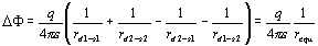 q is the charge at the source ε is the permittivity of the volume conductor (in this case blood) r is the distance from the source Applying this concept to a tetrapolar electrode arrangement, with current sources d1, d2 and sense electrodes s1, s2, the potential difference between two electrodes, ΔΦ is given by Eq. 3 [Salo, 1989].
