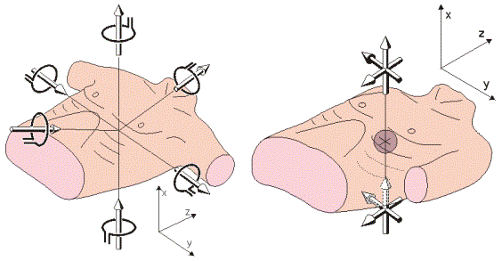 ![]() Figure 1. A ) The tree components of the ideal vectorelectrocardiographic lead system. B ) The three components of the ideal vectormagnetocardiographic lead system. 5. Recording of the Vectormagnetocardiogram In theory, the most straightforward method to record the VMCG is to make bipolar measurements of the magnetic source on the three coordinate axes. This is called the XYZ-lead system. For practical reasons this is not possible to realize. Some improvement may be achieved by rotating the coordinates to more symmetrical orientation as ABC-coordinates. The most practical way is to make the three orthogonal recordings in a single location above the heart. This is called the Unipositional lead system. The quality of the lead field is much improved if such recordings are made symmetrically on both sides of the thorax. (Malmivuo and Plonsey, 1995)