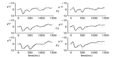 J. Lian1, E. Donchin3, B. He1 Abstract: The present study aims to identify topographic location of the neural sources underlying the verbal memory encoding, by cortical imaging analysis of the event-related potentials recorded from 11 healthy subjects participating in word encoding tasks. Both rote and elaborative strategies were used to memorize the words. The cortical potentials corresponding to the P300 component, which was elicited by the isolate words, were inversely estimated. The principal components analysis was further applied to extract major spatial components. The present results suggest that verbal memory encoding is subserved by different brain structures. Their different levels of activation may be correlated with recall performance, and may be affected by memory strategies. INTRODUCTION Tremendous effort has been made to elucidate neural mechanisms that participate in the implementation of episodic memory. Previous findings suggest that different neural systems participate in the episodic memory encoding, including the prefrontal cortex and the medial temporal lobe (MTL) [1-2]. The event related potential (ERP) has excellent temporal resolution desired for memory study. Different ERP components have been correlated with subsequent memory depending on the subject’s encoding strategy, on the specific nature of the stimuli and on many other factors [3]. Particularly, the P300, which is elicited by deviant events presented within the context of the oddball paradigm [3,4], has been demonstrated to be positively correlated with the subsequent recall performance when using rote rehearsal strategy. However, the scalp ERP has limited spatial resolution due to the head volume conduction effect [5]. Several EEG-based high-resolution brain imaging techniques have been developed in the past decades [6-10]. Of noteworthy is the cortical imaging technique (CIT) [10], which has been demonstrated to be able to map neural sources associated with P300 and novelty P3 components [11]. In the present study, we utilize the CIT to estimate the cortical potentials (CPs) underlying the P300 component elicited by isolate words during episodic memory encoding tasks. Then principal component analysis (PCA) is applied to the CPs for dimensionality reduction and for extraction of major spatial components [12]. METHODS Eleven subjects were enrolled in the study under a protocol approved by the IRB/UIUC. Each participant studied 40 lists of 15 words each for subsequent memory testing. Each list contained one isolate word with larger font randomly assigned in the 6th-10th position. Participants were instructed to memorize the words either by silently repeating the words (rote strategy), or by connecting the words into a story (elaborative strategy). Right after the presentation of each list, the participant’s memory for the list was tested by a pencil-and-paper free recall test. The scalp potential was recorded during the presentation of the word lists with 129-channel EGI system. ERPs were obtained by averaging trials of each condition for each subject. For each of the 4 conditions (recalled or not recalled, rote or elaborate), ERPs were grand averaged across all 11 subjects for CIT analysis. A 3-sphere inhomogeneous head model was used in the present study [10]. A closed-surface dipole layer was constructed to equivalently represent all the enclosed brain sources. The scalp potentials Fs and the equivalent dipole moments F can be linearly related by a transfer matrix A, such that AF=Fs, Then the cortical potential Fc can be calculated by Fc=BF=BA+Fs, where A+ is the pseudo-inverse of A, and B is the transfer matrix relating Fc and F. Then PCA was applied to an association matrix representing the covariance between each pair of the cortical observations. The covariances are computed on the epoch of P300 component, but separated by rote and elaborative strategies. RESULTS Figure 1 shows the midline 3-channel ERP waves elicited by the isolates, when using rote and elaborative strategies, separated as a function of whether the words were subsequently recalled or not. Clearly, isolates elicited large P300 component at about 500 ms after stimulus onset. ![]()