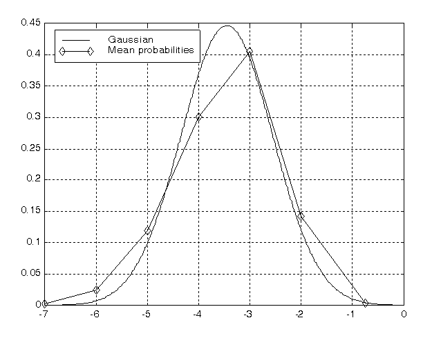 Figure 1: Comparison between Normal Distribution and practical FA probabilities. DISCUSSION None of the subjects registered a positive FA, which means the T wave in healthy subjects was always asymmetric, with its initial part predominant over the half posterior to the peak value. Most of the heart beats in any subject had FA values inside the interval -4.5 ≤ FA ≤ -2.5 (Subj.1: 62.12%; Subj.2: 67.47%; Subj.3: 82.24%). In other words, the initial part of the T wave usually was 1.64 to 2.64 times greater than the posterior area. Figure 1 depicts the plot of the FA mean probabilities and a Gaussian curve calculated with the mean values of this estimator (Table II). Despite the few subjects reported, it still can be noticed a good correlation between the curves. Further tests are needed to validate this Gaussian model of the Asymmetry Factor, though. They must include not only normal ECG but also data recorded during a hypoglycaemic episode. Acknowledgments: Work supported by the Brazilian National Council of Scientific and Technological Development. REFERENCES[1] J.M.G. Ingelmo, A.N. Angulo, E.H. González, et al.. “Alteraciones electrocardiográficas en la hipoglucemia,” Rev.Esp. Cardiol., vol. 51, pp. 404-406, 1998. [2] J.L.B. Marques, E. George, S.R. Peacev, et al.. “Altered Ventricular Repolarization During Hypoglycaemia in Patients with Diabetes,” Diabetic Medicine, vol. 14, pp. 648-654, 1997. [3] R.H. Ireland, R.T.C.E. Robinson, S.R. Heller, et. al.. “QT measurement for TU fused ECG morphology as exhibited during hypoglycaemia,” in Proceedings of the 20th Annual International Conference of the IEEE Engineering in Medicine and Biology Society, 1998, pp. 240-242. [4] I.S.N. Murthy, G.S.S. Durga Prasad. “Analysis of ECG from Pole-Zero Models,” IEEE Trans. On Biom. Eng., vol. 39, pp. 741-751, 1992. [5] J.A. Vila, Y. Gang, J.M.R. Presedo, et al.. “A New Approach for TU Complex Characterization,” IEEE Trans. On Biom. Eng., vol. 47, pp. 764-772, 2000. [6] M. Merri, J. Benhorin, M. Alberti, et al.. “Electrocardiographic Quantitation of Ventricular Repolarization,” Circulation, vol. 80, pp. 1301-1308, 1989. [7] E.V. Garcia, Instrumentação para a monitoração das alterações eletrocardiográficas decorrentes da hipoglicemia. Florianópolis: UFSC, 2001.
