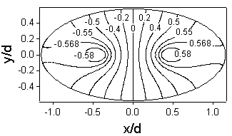 Figure 3. Contour map of the electric potential on the base of a cylinder with a/b = 2 and l/d = 0.8. The dipolar source is at the cylinder center and aligned with the ellipse major axis. CONCLUSION We have systematically studied the effects of the body asymmetry and dipolar-source position on the presence of more than a pair of surface potential extrema. Our results show that, even in the case of a homogeneous conductor, the presence of more than two local extrema on the surface does not exclude the possibility that the potential is due to a single localized dipolar current source. Therefore, Okada’s state-ment about the maximum number of surface potential extrema is not valid under all circumstances. We have shown that the lack of symmetry of the body under consideration and the position of the source are the factors limiting the validity of this statement. REFERENCES[1] Robert H. Okada, “A critical review of vector electrocardiography,” IEEE Trans. BME, vol.10, pp. 95-98, 1963. [2] P. M. Berry, “N, M space harmonics of the oblate spheroid,” Ann. NY Ac. Sc., vol. 65, pp. 1126-1134, 1957. [3] Ph. Lambin and J. Troquet, “Complete calculation of the electric potential produced by a pair of current source and sink energizing a circular finite length cylinder,” J. Appl. Phys., vol. 54, pp. 4174-4184, 1983.