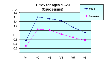 Fig 1. Upper normal limit of T wave amplitudes in V1 – V6 in healthy Caucasian males and females aged 18 – 29 years. Figure 2 provides similar data for males and females aged 50 and over.