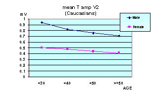 Fig.5. Lower limit of normal T amplitude V2-V6 for healthy Caucasian males and females aged 40-49 years. Gender differences in Chinese individuals are examined in Figure 6 where the maximum T amplitude in the precordial leads is shown.