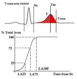Figure 1: Classical methods for the determination of the QT intervals. These classes differ by their definitions of the end of the T wave : 1) when the amplitude of the T wave signal decreases below a certain amplitude level (Panel A), 2) when the first derivative of the T wave pass below a threshold value (Panel B), and 3) when the slope of the final descending portion of the T wave crosses the baseline, the slope being either the maximum slope of this terminal portion (Panel C) or a least squares model fitting this terminal portion (Panel D) (6-8) . This list is not exhaustive but rather describes the most popular approaches. Other interesting methods identifying the end of the T wave and quantify QT dispersion using different approaches have been published (9;10) . The source of instability of computerized approaches are explained by the large variety of T wave shapes recorded from the body surface (6) . These main factors characterizing the T wave morphology are the following: 1) The amplitude constraint: the common limitation to all these approaches is their need for having T wave with sufficient amplitude to identify a terminal portion and then identify a slope and/or a significant decrease in this slope. If the T wave is flat most of the techniques fail determining the end of the T wave (3;11) . 2) The shape constraint: having a biphasic T wave can create unexpected results with certain types of algorithm trying to identify the terminal descending slope of the T wave. The occurrence of U waves is also a noticeable shape-related issue for computer and manual measurements (12) . Encompassing the U wave in the repolarization measurement is still a controversial issue and the occurrence of U wave may affect the stability of computerized approaches. 3) The baseline, the respiratory and body movement factors: these specific factors are quite accurately addressed in the current commercial systems (13) ,and in research-oriented software (14) . It is however of concern in Holter ECG data where signal to noise ratio and signal quality in general are lower (15) . Finally the noise level has impact on the determination of the end of the T wave and more profoundly in Holter ECG recordings than in bedside. Area-based approach: The area-based approach is based on the cumulative integration of the T wave (Figure 2). It provides a curve describing the evolution of the area under the T waves across time. The curve is normalized in amplitude. Then, percentages of the maximum amplitude are used to define time intervals (Figure 3) (16) . The method does not need an accurate determination of the end of the T wave rather it requires the T wave to have a right tail rapidly converging to the baseline level. Figure 2: examples of repolarization measurements on a biphasic T-wave (measurements done on the bold signal). Figure 3: area-based approach based on the normalized total area of the T wave. The area-based approach provides a different approach for the measurements of the repolarization segment. Its main interest is linked to its ability to consider the entire repolarization morphology instead of the terminal portion for the identification of the end of the T wave. Under good signal condition, such approach should allow for more stable measurements and could allow measurements in low-amplitude T wave. More investigations are needed and are currently in process for demonstrating the benefits of this approach. Reference List 1. Murray A, McLaughlin NB, Bourke JP et al. Errors in manual measurement of QT intervals. Br Heart J. 1994;71:386-390. 2. Puddu PE, Bernard PM, Chaitman BR et al. QT interval measurement by a computer assisted program: a potentially useful clinical parameter. J Electrocardiol. 1982;15:15-21. 3. Murray A, McLaughlin NB, Campbell RW. Measuring QT dispersion: man versus machine. Heart. 1997;77:539-542. 4. Kors JA, van Herpen G. The coming of age of computerized ECG processing: can it replace the cardiologist in epidemiological studies and clinical trials? Medinfo. 2001;10:1161-1167. 5. Moss AJ, Zareba W, Benhorin J et al. ISHNE guidelines for electrocardiographic evaluation of drug-related QT prolongation and other alterations in ventricular repolarization: task force summary. A report of the Task Force of the International Society for Holter and Noninvasive Electrocardiology (ISHNE), Committee on Ventricular Repolarization. Ann Noninvasive Electrocardiol. 2001;6:333-341. 6. Xue Q, Reddy S. Algorithms for computerized QT analysis. J Electrocardiol. 1998;30 Suppl:181-186. 7. van Bemmel JH, Zywietz C, Kors JA. Signal analysis for ECG interpretation. Methods Inf Med. 1990;29:317-329. 8. McLaughlin NB, Campbell RW, Murray A. Comparison of automatic QT measurement techniques in the normal 12 lead electrocardiogram. Br Heart J. 1995;74:84-89. 9. Acar B, Yi G, Hnatkova K et al. Spatial, temporal and wavefront direction characteristics of 12-lead T-wave morphology. Med Biol Eng Comput. 1999;37:574-584. 10. Lund K, Nygaard H, Kirstein PA. Weighing the QT intervals with the slope or the amplitude of the T wave. Ann Noninvasive Electrocardiol. 2002;7:4-9. 11. McLaughlin NB, Campbell RW, Murray A. Accuracy of four automatic QT measurement techniques in cardiac patients and healthy subjects. Heart. 1996;76:422-426. 12. Ireland RH, Robinson RT, Heller SR et al. Measurement of high resolution ECG QT interval during controlled euglycaemia and hypoglycaemia. Physiol Meas. 2000;21:295-303. 13. Gang Y, Guo XH, Crook R et al. Computerised measurements of QT dispersion in healthy subjects. Heart. 1998;80:459-466. 14. Coumel P, Fayn J, Maison-Blanche P et al. Clinical relevance of assessing QT dynamicity in Holter recordings. J Electrocardiol. 1994;27 Suppl:62-66. 15. Tikkanen PE, Sellin LC, Kinnunen HO et al. Using simulated noise to define optimal QT intervals for computer analysis of ambulatory ECG. Med Eng Phys. 1999;21:15-25. 16. Merri M, Benhorin J, Alberti M et al. Electrocardiographic quantitation o