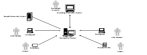 Figure 1. Philips ECG Management System and its interactive components. 3. Applications Research. Ownership of ECG databases on a commercial management system has been debated over a few decades. The openness of the industrial standardized XML format, a major breakthrough in the Philips EMS, allows researchers to own the ECG databases. Issues related to proprietary format no longer exist. Researchers in medical and pharmaceutical studies have complete flexibility in storage, searching and accessing patient data, ECG interpretation and the digital ECG waveform in high fidelity. Education. ECG reading is an art in medical science. ECG variations shown in textbooks are very limited. Without an ECG database management system, training in ECG reading can be very difficult. In the Philips EMS, ECG examples can be searched, retrieved, displayed and printed in seconds. The database can be queried easily using the SQL editor and SQL aware tools. ECG Management. ECG data aid decision-making. One of the many advantages using an ECG management system is the ability to perform serial ECG comparisons [Ariet, 1991]. The serial comparison algorithm assists cardiologists in ECG diagnosis and evaluating progression or regression of a condition. Furthermore, most hospitals in the United States are experiencing a shortage of experienced ECG professionals. The Philips EMS automates ECG order and reports order fulfillment to offset the resource shortage. The process of downloading ECG orders from the HIS order entry system, entering ECG order fulfillment in the HIS billing system, and reporting confirmed ECG reading to the enterprise clinical information system, can be configured in the workflow layer to maximize process automation. 4. Conclusions The system design is focused on the needs of researchers and health care professionals. The system is adaptable and scalable to meet a wide variety of IT and clinical information environments in the United States and worldwide. Although the system is non‑trivial and may be considered a complex clinical information system, it is easily accessible via a standard web-based application, and is flexibly configurable to satisfy the varying requirements of cardiology departments for enhanced patient care. References Ariet M, Crevasse L, Caverly S, Leggett S, Greenfield J: Computerized serial comparison of electrocardiograms. J Electrocardiol 23(supp):123-131, 1991. Gamon R, Cooper A: Applying an ECG database to aid decision-making in the A&E. Accid Emerg Nurs 10(2):62-62, 2002. Norman JE, Bailey JJ, Berson AS, et al.: NHLBI workshop on the utilization of ECG databases: preservation and use of existing ECG databases and development of future resources. J Electrocardiol, 31(2):83-89, 1998. Nose Y, Akazawa K, Yokota M, et al.: An electrocardiogram database incorporated into the hospital information system. Med Inform (Lond), 12(1):1-9, 1987. Wang C, Ohe K, Sakurai T, Nagase T, Kaihara S: An ECG storage and retrieval system embedded in client server HIS utilizing object-oriented DB. J Med Syst 20(10):35-43, 1996.